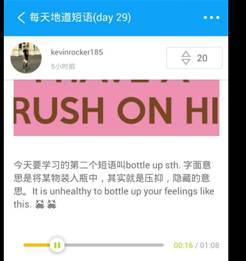 课前预习和课后评价是提高课堂效率和改进课堂教学的关键,为此,两位老师建立了大学英语教学实验班的QQ群,在每单元教学前将授课内容、相关的背景资料、音频视频等上传,使学生能在课前进行有指导性的预习,在课堂上设计丰富的教学活动,如单词接龙、PPT制作讲解、模拟情景剧表演等,单元学习结束后要求学生通过点赞、评论或转发的形式评价学习效果。同时推荐学生使用英语学习类APP进行自主学习,如通过“百词斩”、“扇贝单词”等学习软件为学生设定考级单词的总量和每日进度,并要求学生每周上传完成情况;通过“有道口语大师”软件让学生从新手班晋级流利班和精英班;通过“英语趣配音”软件让学生模仿电影原声的语音语调并将自己的模仿秀供师生欣赏评价,培养了学生用手机学习英语的良好习惯,调动了学生自主学习的积极性。