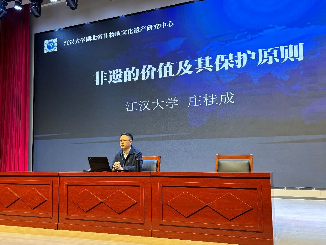 (通讯员 山雨)11月29日下午,江汉大学研究生院院长、武汉市非物质文化遗产保护专家庄桂成教授,应邀为我校师生开展了《非遗的价值及其保护原则》的专题讲座。本次讲座由通识学院主办,通识学院院长李洪斌主持,数百名学生到场聆听。