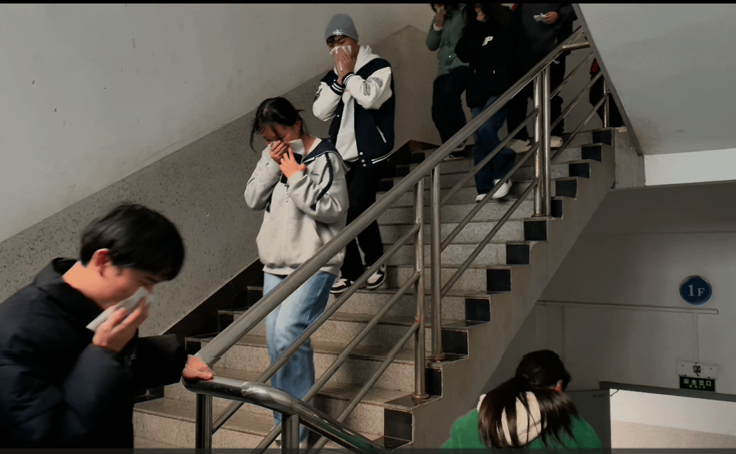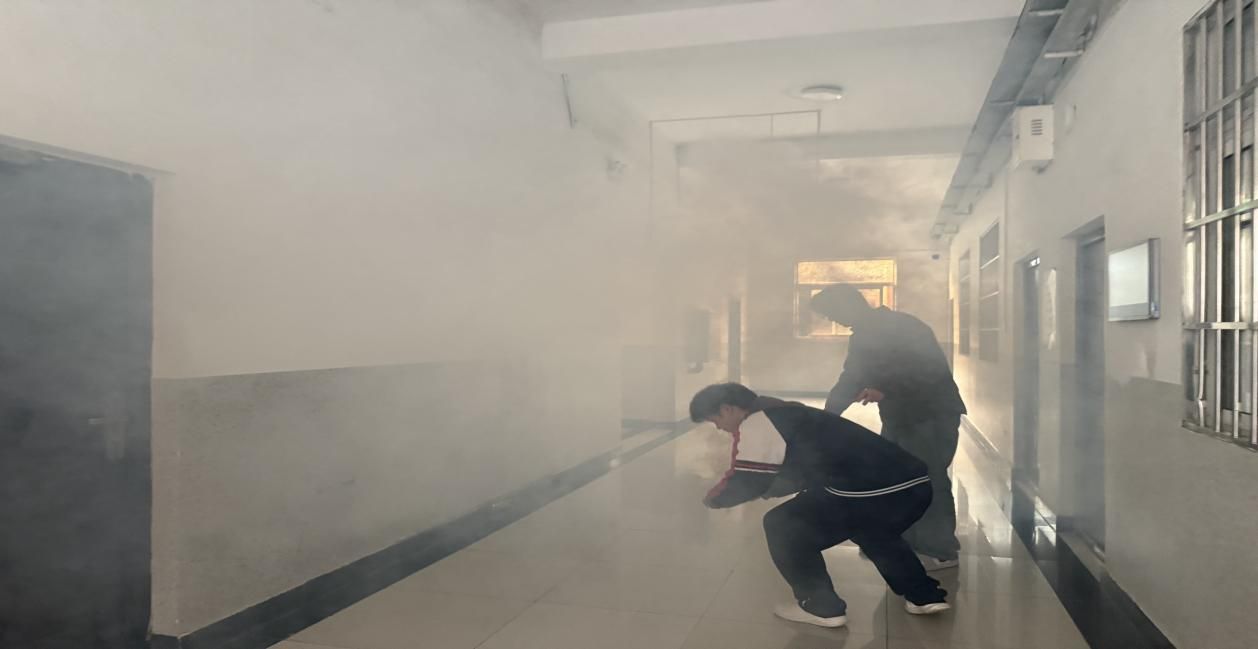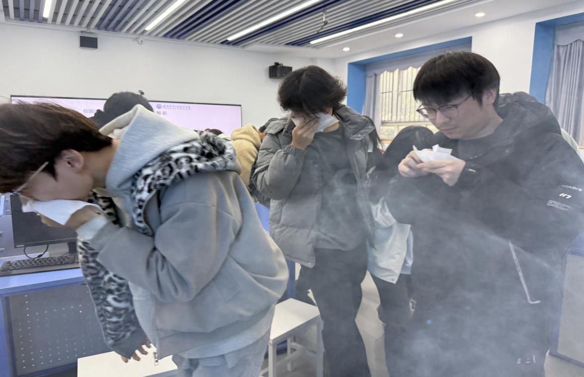 本次演练紧扣“聚焦逃生救援关键,深化‘生命通道’畅通攻坚”的任务要求,打破传统单一演练模式。活动伊始,首先对参演师生进行了关键消防知识与疏散要点的集中讲解,随即无缝转入实战演练阶段。演练模拟实训室因电线短路引发“火情”,情景设置贴近真实。警报响起后,师生反应迅速,动作规范,均能利用湿毛巾等物品捂住口鼻、低姿前进疏散,互帮互助,未出现任何慌乱推挤,全员安全、快速撤离至综合楼前广场集合点,并高效完成人员清点与报告,实现了100%安全疏散。57名师生在疏散过程中秩序井然,严格遵循“预警发布→初期处置→疏散引导→集结清点→总结讲评”的清晰流程。