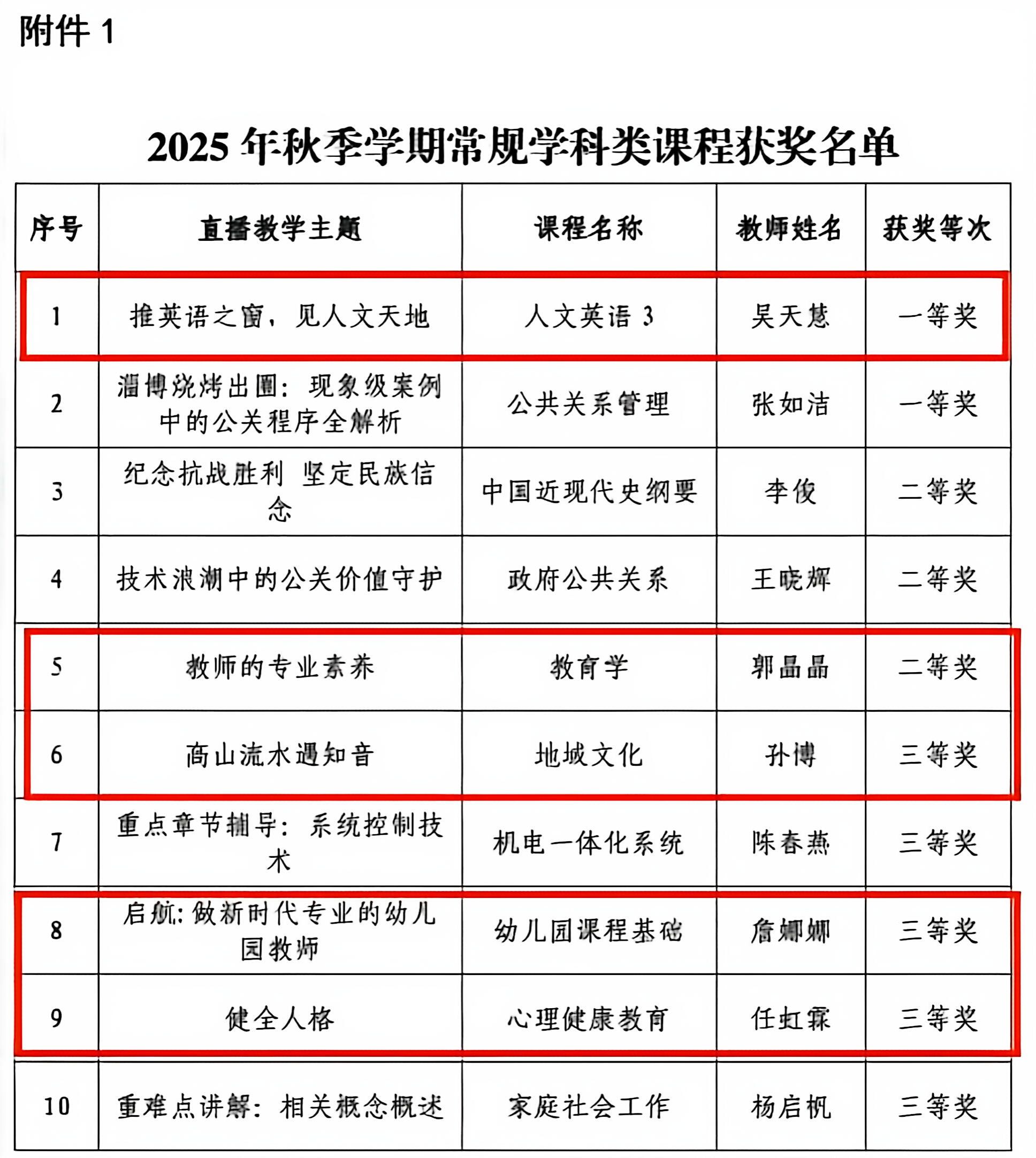 在常规学科类课程评选中,学院吴天慧老师的“推英语之窗,见人文天地”(人文英语 3)荣获一等奖;郭晶晶老师的“教师的专业素养”(教育学)荣获二等奖;孙博老师的“高山流水遇知音”(地域文化)、詹娜娜老师的“启航:做新时代专业的幼儿园教师”(幼儿园课程基础)、任虹霖老师的“健全人格”(心理健康教育)荣获三等奖,多门课程获奖彰显了学院在常规学科直播教学中的扎实功底。