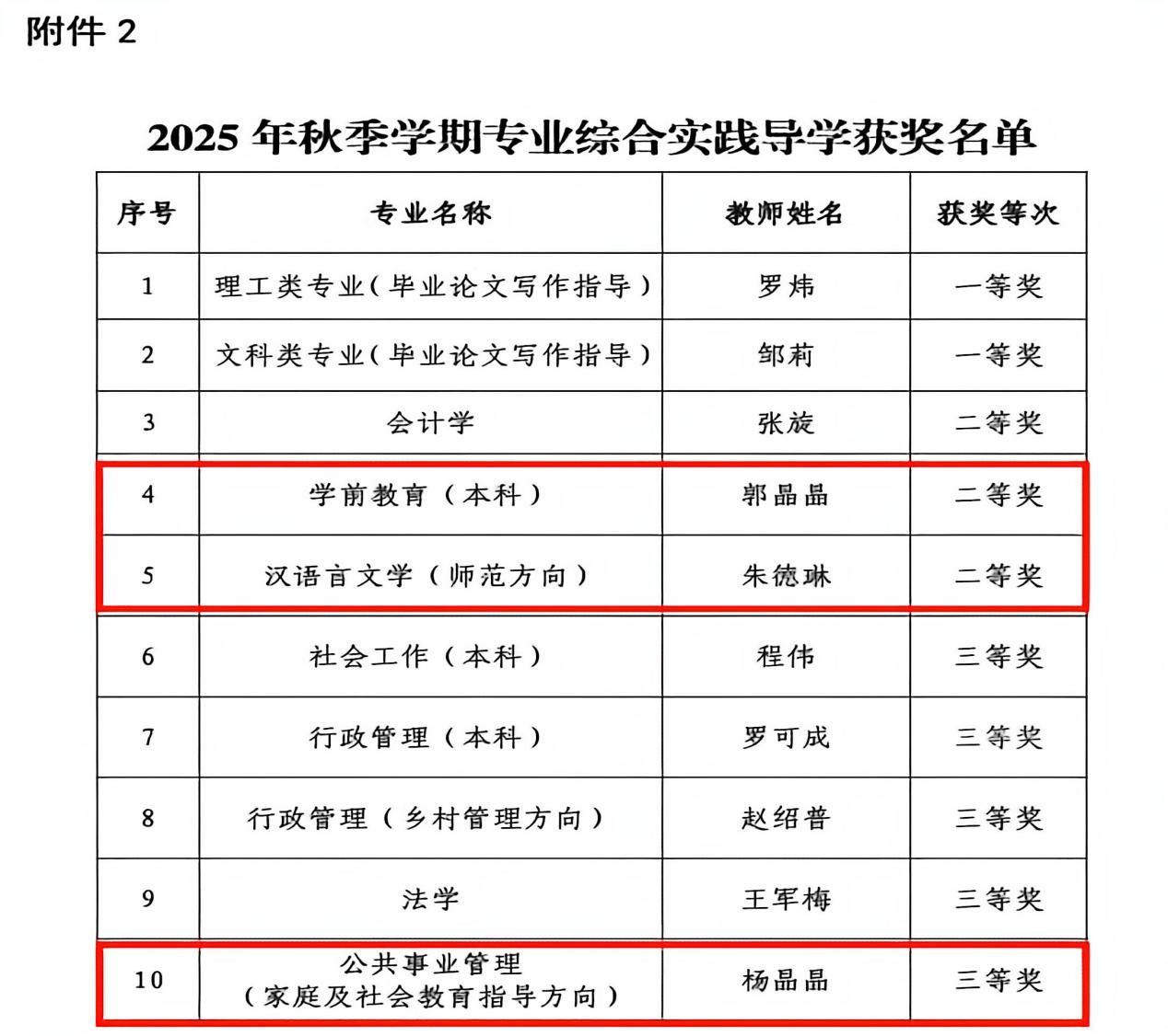 在专业综合实践导学评选中,郭晶晶老师负责的学前教育(本科)、朱德琳老师负责的汉语言文学(师范方向)、杨晶晶老师负责的公共事业管理(家庭及社会教育指导方向)均荣获二等奖,体现了学院在专业实践教学指导方面的突出能力。