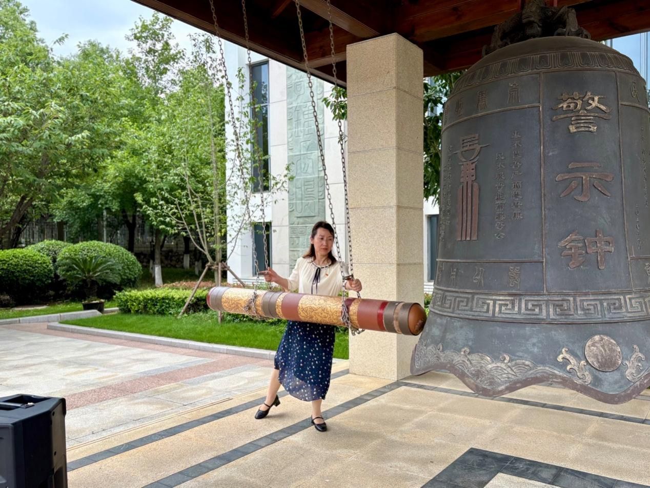 随后,在警示教育广场,全体党员整齐列队,面向廉政警钟,庄严肃穆。党总支书记朱德琳敲响警钟,三声悠长深沉的钟鸣,回荡在每位党员心中,既是对党规党纪的庄严宣示,也是对廉洁自律的深刻警醒。朱书记强调:“此次警示教育是深入贯彻中央八项规定精神学习教育的重要一课,全体党员要以案为鉴、警钟长鸣,始终做到心有所畏、言有所戒、行有所止,严守纪律红线,筑牢廉洁底线,让此次活动成为砥砺初心、淬炼党性的生动实践和深刻记忆。”
