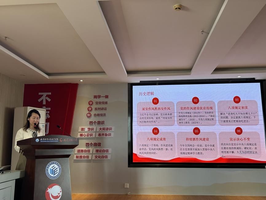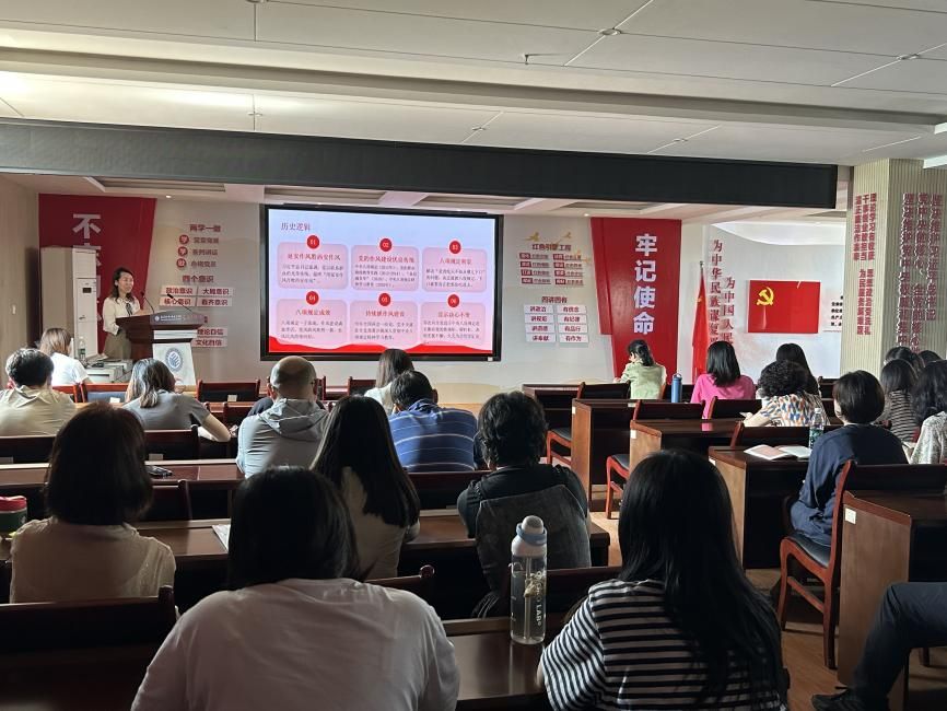 党课围绕提高站位、深学细悟、总结成绩、警钟长鸣、整改整治、砥砺前行六个方面展开。朱德琳书记从历史、政治、治理、实践四个逻辑维度,阐明深入贯彻中央八项规定精神是加强党的作风建设和全面从严治党的重要举措。她带领党员回顾建党百多年来一以贯之加强作风建设的历史经验,引导党员把握作风建设的时代内涵与核心要义,总结贯彻落实中央八项规定精神的显著成效,剖析教育领域“四风”典型案例,提出整改整治、改进作风的重要举措,激励全体党员做好新时代作风建设的教育答卷人。