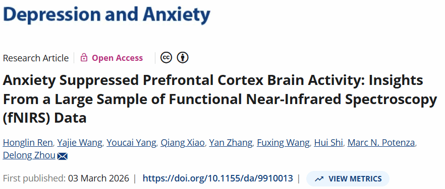 (通讯员:任虹霖 金琼 杨晶晶 )近日,我校通识学院心理健康教师任虹霖(华中师范大学心理学博士生)作为第一作者,在临床心理学领域国际权威顶级期刊《Depression and Anxiety》(中科院1区、JCR Q1)上发表了一项关于大学生焦虑情绪与大脑前额叶皮层功能的研究成果。论文题为:Anxiety Suppressed Prefrontal Cortex Brain Activity: Insights From a Large Sample of Functional Near-Infrared Spectroscopy (fNIRS) Data(见图1)。该成果的发表,不仅彰显了学校在心理健康教育研究领域的持续进步,也体现了我校科研工作高质量发展的又一重要突破。