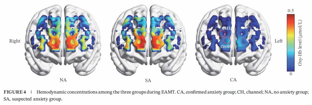 研究聚焦于焦虑情绪与大脑前额叶皮层功能异常之间的神经生物学机制,采用国际前沿的功能性近红外光谱技术(fNIRS),对841名大学生在自然状态下的情绪自传体记忆任务进行了测试。研究首次发现:确诊焦虑的大学生在大脑右侧额极皮层(rFPC)的血氧浓度(Oxy-Hb)显著降低,这种低激活状态可以作为区分临床显著焦虑群体的重要神经特征(见图2)。